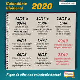As etapas do processo eleitoral estão descritas no cronograma previsto na Resolução TSE n.º 23.6060/2019, que estabelece, mês a mês, as datas do Calendário Eleitoral.
