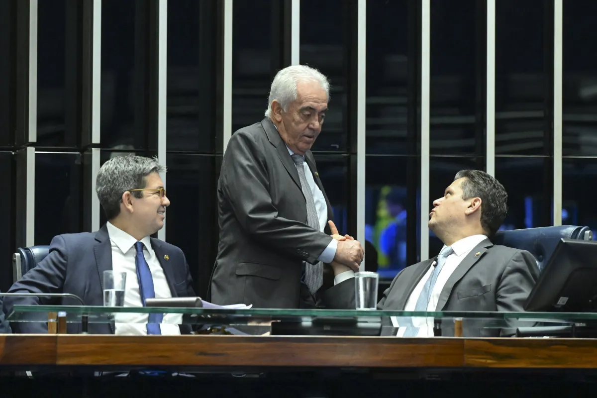 O lider do governo no Congresso, Randolfe Rodrigues (PT-AP); o presidente da CCJ do Senado, Oto Alencar (PSD-BA); e o presidente do Senado, Davi Alcolumbre (União Brasil-AP), durante a sessão plenária (Foto: Carlos Moura/Agência Senado)